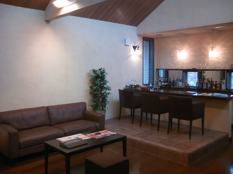 まで据え付けてあります。床もダークなフローリングでまとめてあり、シックと いう印象です。バーカウンタースペースの床だけが少し高くなっていて、ひな壇状になっています。ちょっとやりすぎという感じが否めませんが、それでも相当凝った跡 が伺えます。