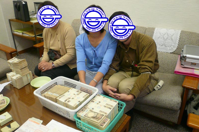 『これが消えていくのね〜』とおもうと少し悲しくなりますが、そうもいっていられません。幻の現金を写真に納め、嫁さんとツーショット
