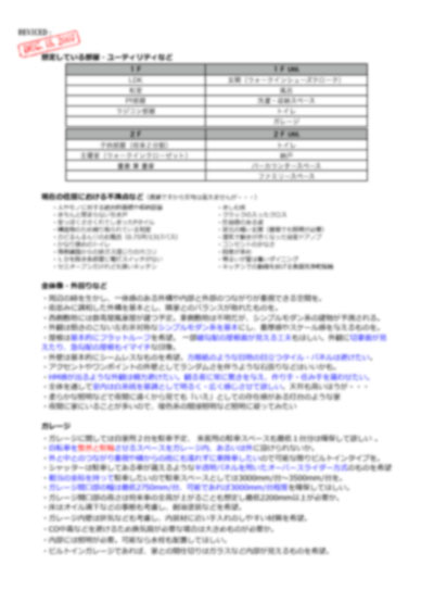 に対する要望をまとめて記載していくことにしました。最初は単なるテキスト打ちでほとんど殴り書きのような状態です。シンプルモダンな外観を希望することやLDKを明るく、広くとるなどなど・・思いつく限り書き込んでみました。とりあえずA4枚に収まるくらいの箇条書きでした。まずはこの要望書で今後の条件を提示することにしたのです。