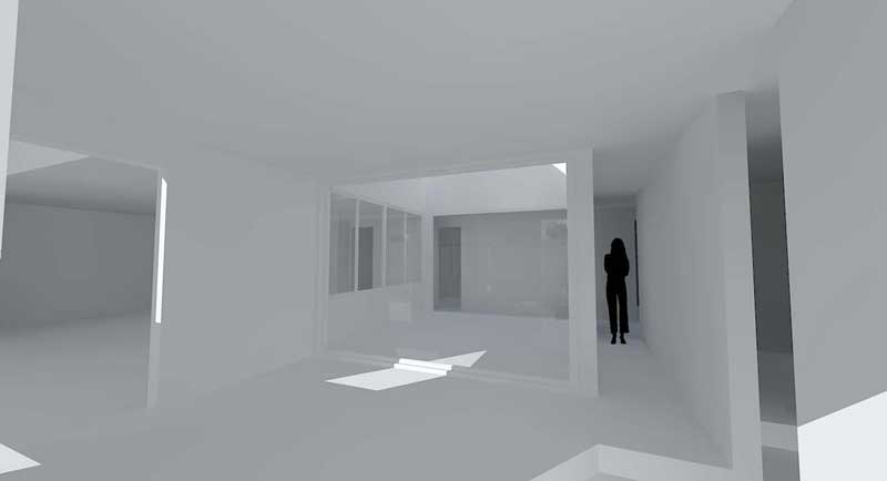 のみなのでクレイモデルのような感じになりましたがおおざっぱな検討には使えます。上のパースではやはり廊下が狭く感じます。女性のシルエットを置いてみましたが、すれ違いするにはちょっと巾が足りなさそうですねぇ・・・。で中庭メインのショット