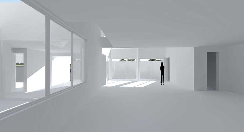 本来なら向かって左側の壁際には階段が来るはずですが、とりあえず何も置かずにレンダリングしてます。また右側にはキッチンが見える予定です。床も天井も壁もすべて白なのでかなり明るく感じますが、嫁さんの意向ではここはフローリングにしたい様子。まだインテリアを決める段階ではないのですが、今後検討が必要ですね。