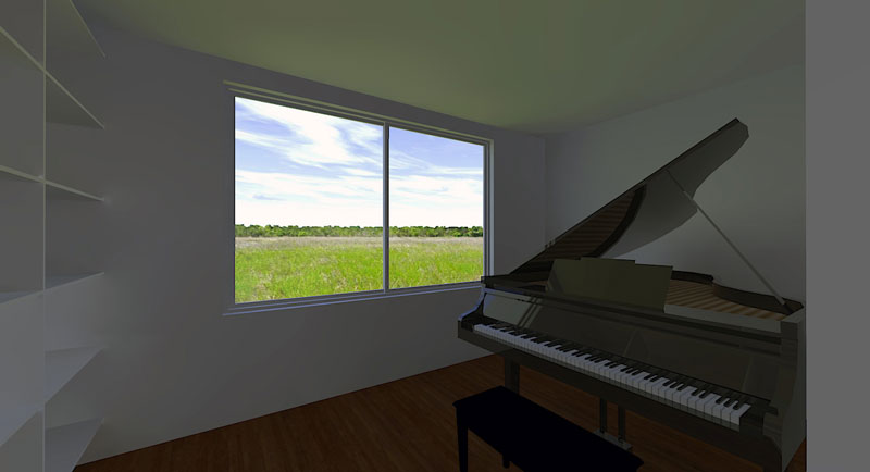 。一番北側の部屋ですが、まぁそこそこ明るそうです。窓の外には緑が広がっていますが、実際には10mほど離れて3階建ての公共建築が建っているはずです。ピアノ部屋に入ってすぐのパース