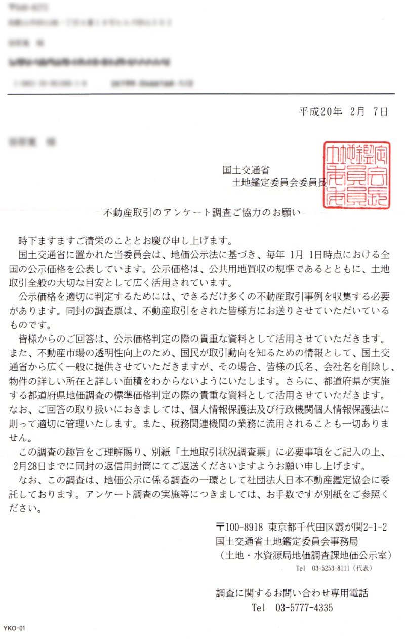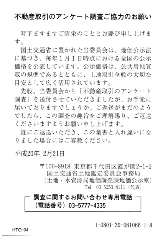 土地取引が終わってから約1ヶ月後、国土交通省から見慣れぬ封筒が届きました。封を開けてみると【不動産取引のアンケート調査ご協力のお願い】という国土交通省 土地鑑定委員長名でのアンケートでした。どうやら、土地の取引価格の調査をしているようです。確かに実際の取引価格がわからないことには路線価を策定することもできないでしょうからねぇ・・・。ただ、めんどくさいし、タダでさえ怪しげな文書が舞い込んでくるご時世です。とりあえずしばらく何も返事をせず様子を見ることにしました。